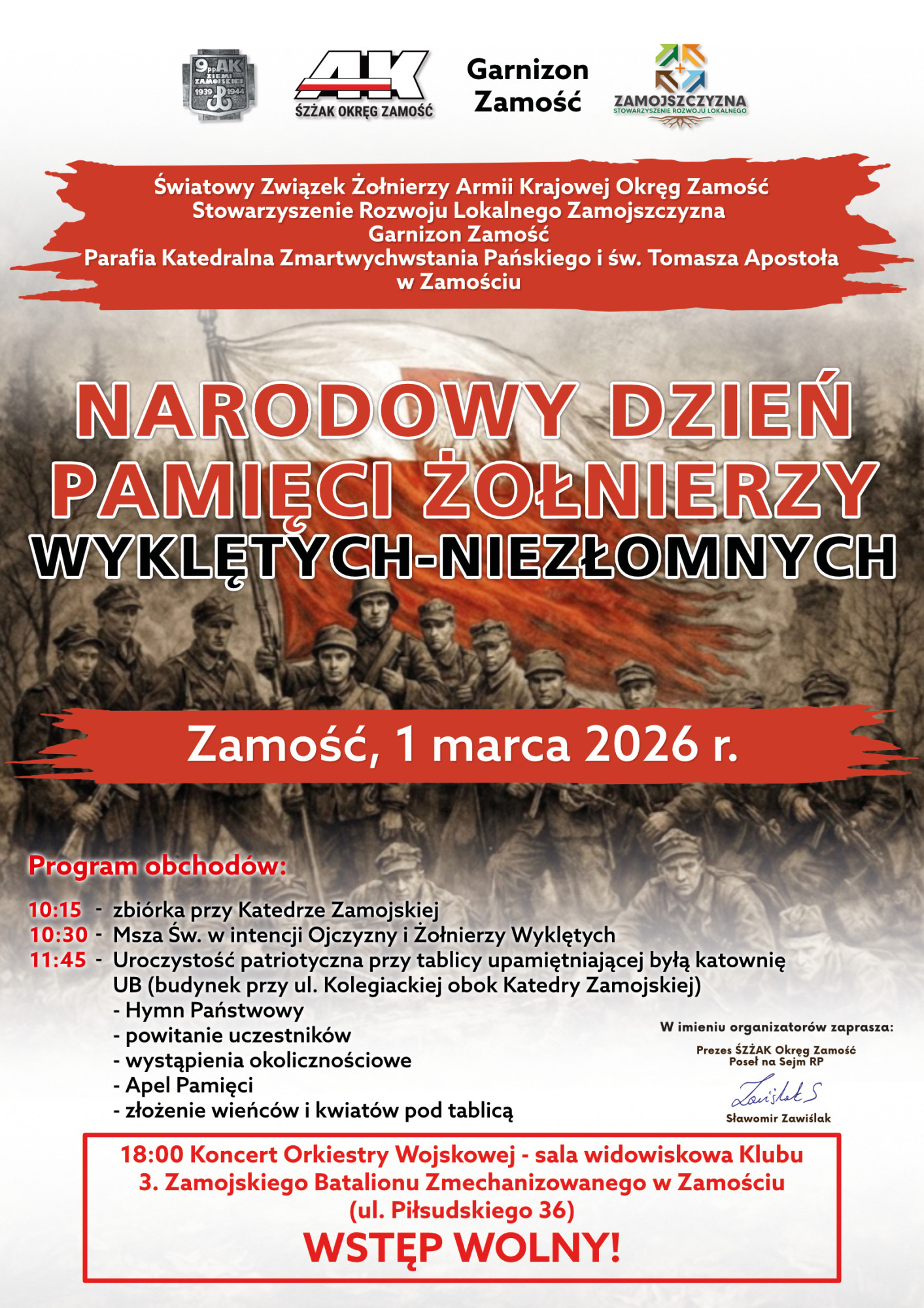Obchody w Zamościu rozpoczną się o godz. 10:15 zbiórką przy Katedrze Zamojskiej. O godz. 10:30 w świątyni zostanie odprawiona Msza Święta w intencji Ojczyzny oraz Żołnierzy Wyklętych. Dalsza część uroczystości zaplanowana jest na godz. 11:45 przy tablicy upamiętniającej byłą katownię UB, znajdującej się przy ul. Kolegiackiej, obok katedry. W programie przewidziano odśpiewanie Hymnu Państwowego, powitanie uczestników, wystąpienia okolicznościowe, Apel Pamięci oraz złożenie wieńców i kwiatów pod tablicą. Zwieńczeniem dnia będzie koncert Orkiestra Wojskowa w Lublinie, który rozpocznie się o godz. 18:00 w sali widowiskowej 3. Zamojskiego Batalionu Zmechanizowanego przy ul. Piłsudskiego 36. Wstęp na wydarzenie jest wolny. Organizatorami zamojskich obchodów są: Światowy Związek Żołnierzy Armii Krajowej Okręg Zamość, Parafia Katedralna Zmartwychwstania Pańskiego i św. Tomasza Apostoła w Zamościu, Garnizon Zamość oraz Stowarzyszenie Rozwoju Lokalnego Zamojszczyzna.