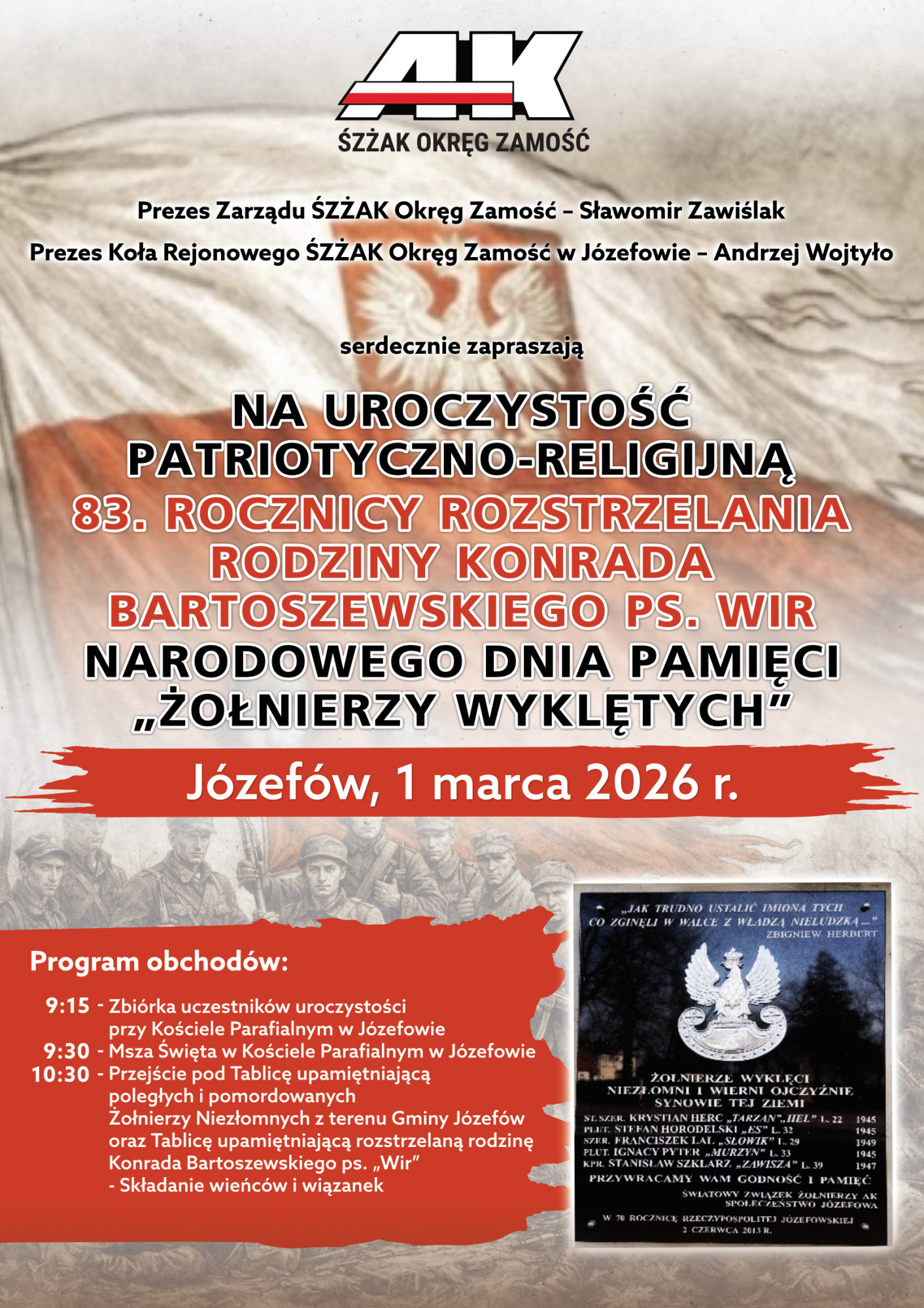 Tego samego dnia obchody odbędą się również w Józefowie, gdzie upamiętniona zostanie 83. rocznica rozstrzelania rodziny Konrada Bartoszewskiego ps. „Wir”. Uroczystości rozpoczną się o godz. 9:15 zbiórką przy Kościele Parafialnym w Józefowie. O godz. 9:30 odprawiona zostanie Msza Święta, po której uczestnicy przejdą pod tablice upamiętniające poległych i pomordowanych Żołnierzy Niezłomnych z terenu gminy Józefów oraz tablicę poświęconą rozstrzelanej rodzinie Konrada Bartoszewskiego. Zwieńczeniem obchodów będzie złożenie wieńców i wiązanek. Organizatorzy podkreślają, że Narodowy Dzień Pamięci Żołnierzy Wyklętych to czas refleksji nad trudną historią powojennej Polski oraz okazja do oddania hołdu tym, którzy po 1945 roku nie złożyli broni i walczyli o suwerenność Ojczyzny. Udział w uroczystościach jest otwarty dla wszystkich mieszkańców regionu.