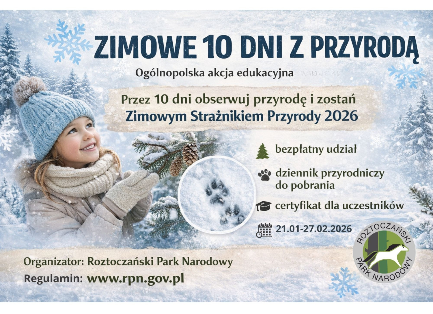 Roztoczański Park Narodowy zaprasza dzieci oraz ich rodziny do udziału w Ogólnopolskiej Akcji Edukacyjnej „Zimowe 10 Dni z Przyrodą”. To propozycja na aktywne i wartościowe spędzenie ferii zimowych 2026 poprzez codzienny kontakt z naturą, obserwację przyrody i naukę jej ochrony.