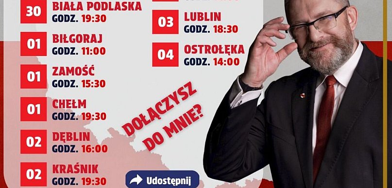 W ramach kampanii prezydenckiej Grzegorz Braun, prezes partii Konfederacja Korony Polskiej, odwiedza Lubelszczyznę, gdzie od 30 kwietnia do 3 maja 2025 roku zaplanowano dziewięć otwartych spotkań z wyborcami. Spotkania odbędą się m.in. w Łukowie, Białej Podlaskiej, Biłgoraju, Chełmie, Zamościu i Lublinie.