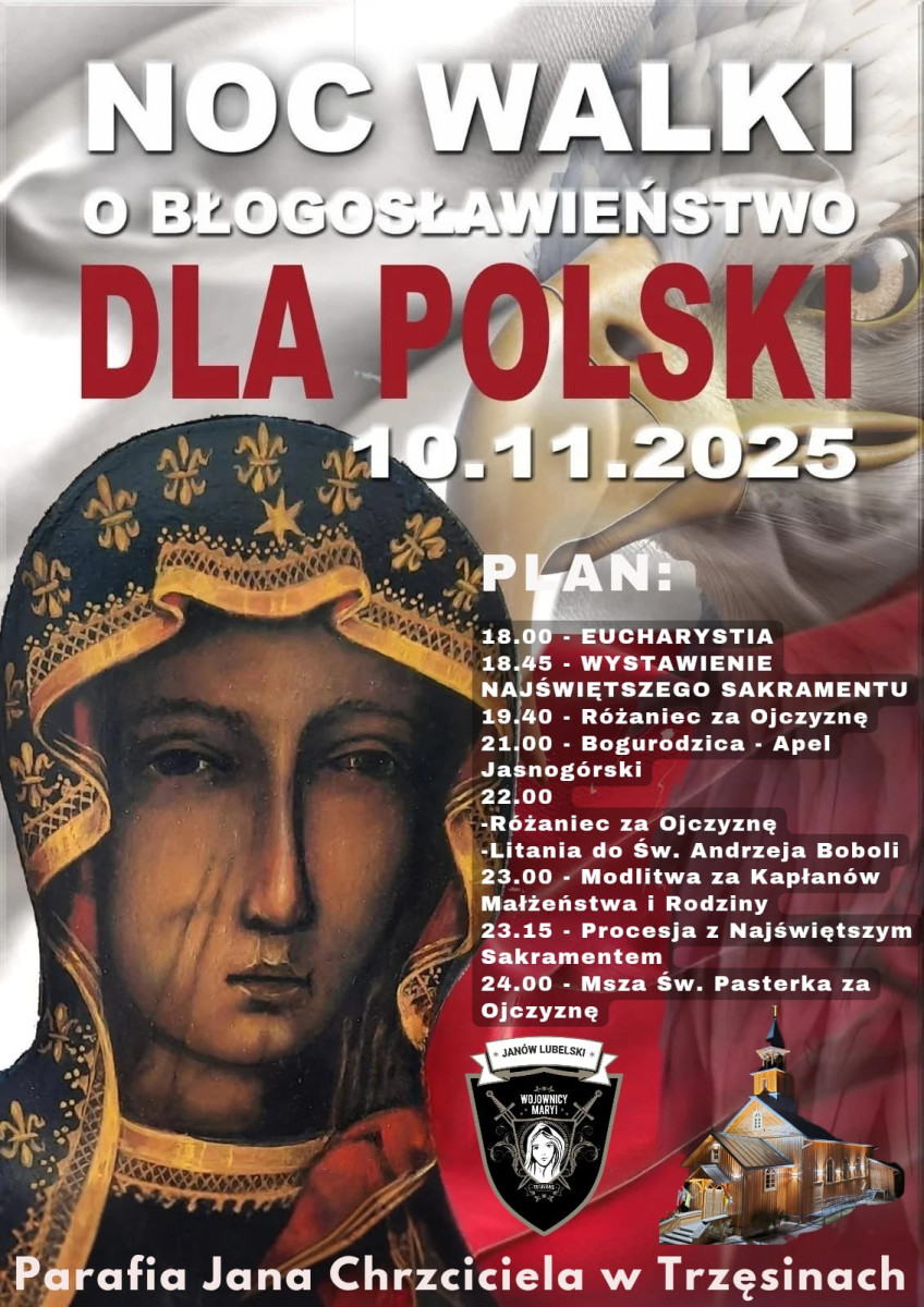 To ma być wyjątkowa noc – pełna ciszy, modlitwy i patriotycznych uniesień. W wigilię Święta Odzyskania Niepodległości w całej Polsce zabrzmi modlitwa o błogosławieństwo dla Ojczyzny. „Noc Walki o Błogosławieństwo dla Polski” zjednoczy wiernych w duchowej walce o wiarę, jedność i pokój.