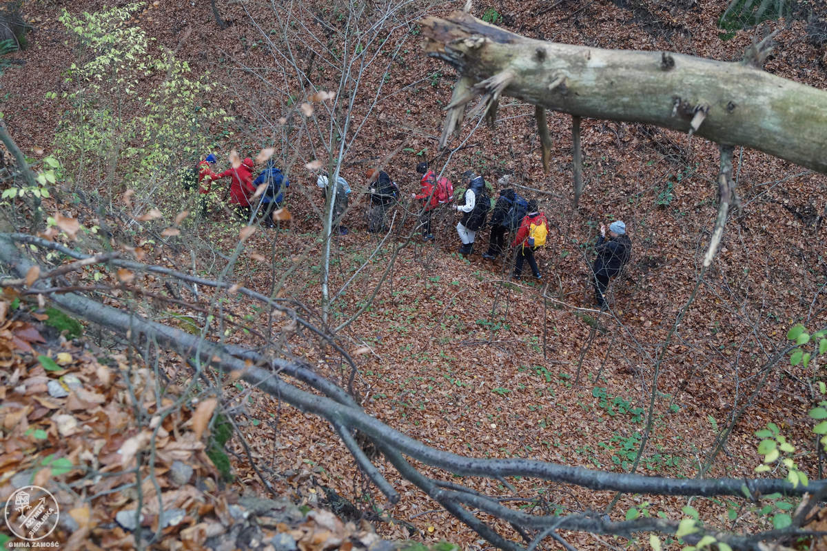Część terenowa rajdu rozpoczęła się w Kawęczynie. Już na starcie na uczestników czekało wymagające podejście, które szybko rozgrzało piechurów. Następnie trasa prowadziła w dół – do jednego z bunkrów partyzanckich ukrytych w lesie Łukaszowiec. To właśnie tam można było poczuć klimat wydarzeń sprzed ponad 80 lat i wyobrazić sobie trud codziennej działalności partyzantów.