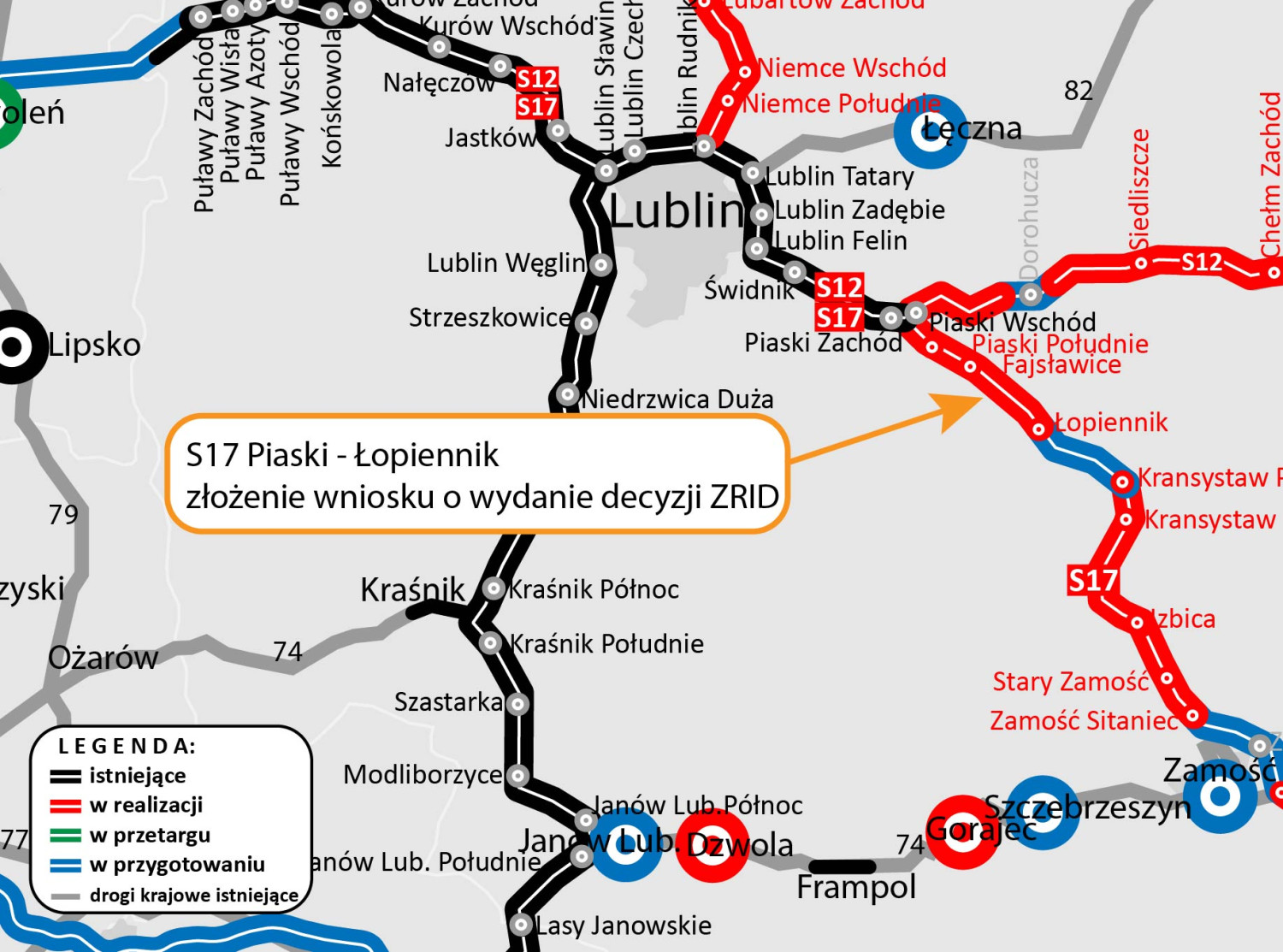 Wykonawca ponad 16-kilometrowego odcinka drogi ekspresowej S17 pomiędzy Piaskami a Łopiennikiem złożył pod koniec września do Wojewody Lubelskiego wniosek o wydanie decyzji ZRID (zezwolenia na realizację inwestycji drogowej). Uzyskanie decyzji umożliwi rozpoczęcie prac budowlanych, które planowane są w przyszłym roku.