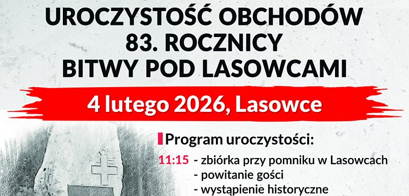 W środę, 4 lutego 2026 roku, w Lasowcach na terenie gminy Krasnobród odbędą się uroczyste obchody 83. rocznicy bitwy pod Lasowcami – jednego z ważniejszych wydarzeń zbrojnych polskiego podziemia niepodległościowego na Zamojszczyźnie w czasie II wojny światowej.