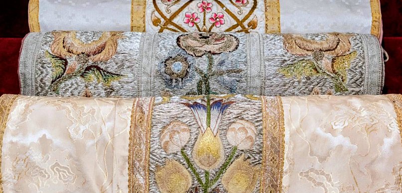 Violetta Dryło z działu edukacji i promocji Muzeum Wsi Lubelskiej w Lublinie przekazała, że wystawa prezentuje przykłady ornatów, dalmatyk i kap z różnych epok historycznych, a także stuły, manipularze, palki, vela i welony oraz umbraculla.