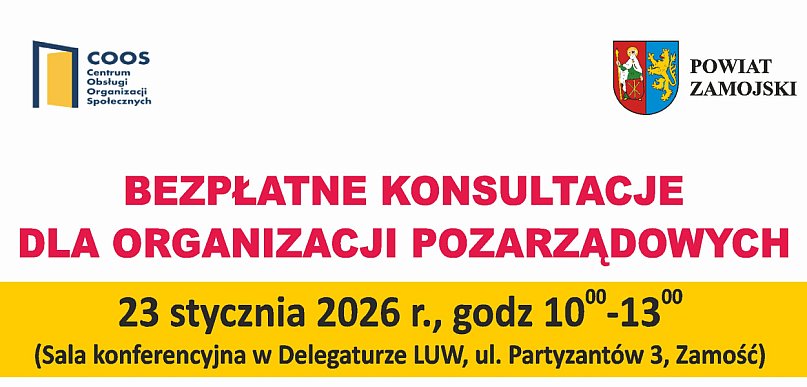 Organizacje pozarządowe z terenu Powiatu Zamojskiego będą miały okazję skorzystać z bezpłatnych konsultacji eksperckich, które odbędą się 23 stycznia 2026 roku w godzinach 10.00–13.00 w sali konferencyjnej Delegatury Lubelskiego Urzędu Wojewódzkiego przy ul. Partyzantów 3 w Zamościu.