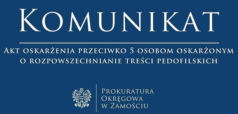 O skierowaniu aktu oskarżenia do Sądu Rejonowego w Tomaszowie Lubelskim poinformował w piątek rzecznik Prokuratury Okręgowej w Zamościu Rafał Kawalec. Śledczy zarzucili pięciu mężczyznom z woj. lubelskiego i podkarpackiego posiadanie i rozpowszechnianie zdjęć i filmów pornograficznych z udziałem małoletnich, zwierząt i z prezentowaniem przemocy.