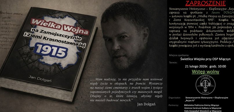 Stowarzyszenie Historyczno – Eksploracyjne „Rejon IV” zaprasza na spotkanie z Janem Dołganiem – autorem książki „Wielka Wojna na Zamojszczyźnie i Ziemi Krasnostawskiej 1915”. Wydarzenie odbędzie się 21 lutego 2026 r. o godz. 10:00 w Świetlicy Wiejskiej przy OSP w Miączynie. Wstęp jest wolny.