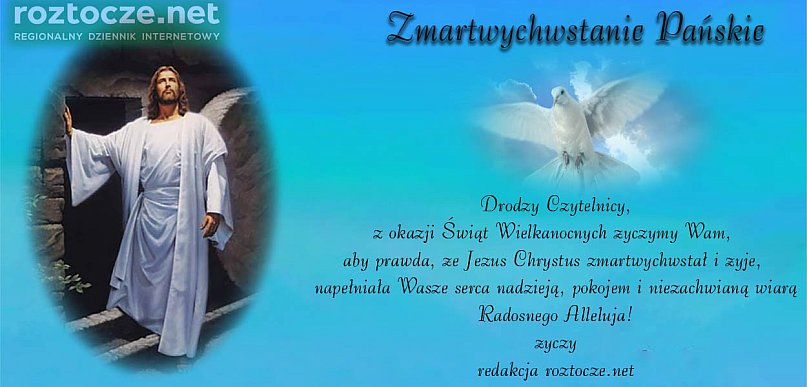 Drodzy Czytelnicy, z okazji Świąt Wielkanocnych życzymy Wam, aby prawda, że Jezus Chrystus zmartwychwstał i żyje, napełniała Wasze serca nadzieją, pokojem i niezachwianą wiarą Radosnego Alleluja! redakcja roztocze.net