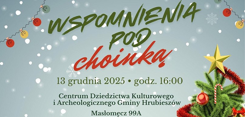 Świąteczna atmosfera zawita do Gminy Hrubieszów 13 grudnia 2025 r. o godz. 16:00. W Centrum Dziedzictwa Kulturowego i Archeologicznego w Masłomęczu odbędzie się wyjątkowe wydarzenie „Wspomnienia pod choinką”, które połączy tradycję, wspólnotę i rodzinne ciepło.
