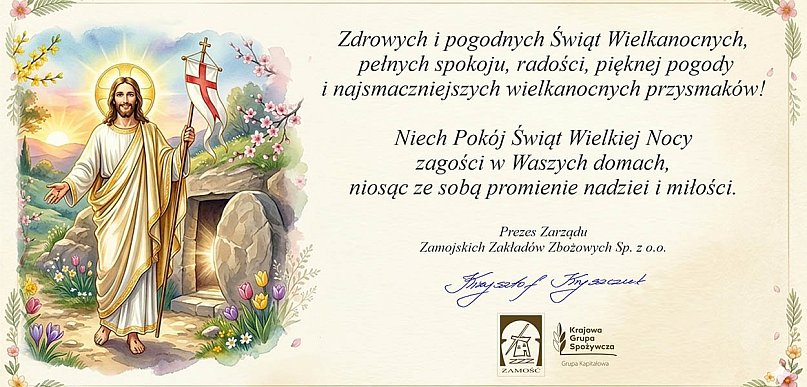 Z okazji Świąt Wielkanocnych Krzysztof Kryszczuk, Prezes Zamojskich Zakładów Zbożowych składa Państwu życzenia.